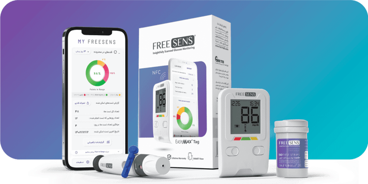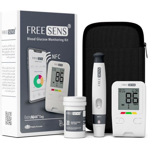 دستگاه قند خون فری سنس ساخت کجاست: دستگاه تست قند خون فری سنس با افتخار ساخت کشور ایران و از تولیدات شرکت فریر آسا طب است. این شرکت از سال ۱۳۸۵ دارای نمایندگی رسمی واردات تجهیزات پزشکی، آزمایشگاهی و داردوخانه ای از کشورهای مختلف است؛ علاوه بر واردات تجهیزات پزشکی، به تولید محصولاتی همچون دستگاه و نوار قند خون فری سنس نیز میپردازد. چرا دستگاه تست قندخون فری سنس بخریم؟ دستگاه تست قند خون فری سنس چیست؟دقت فراتر از انتظار با تکنولوژی های : اندازه گیری بدون خطا در زمان لرزش دست حجم خون ناکافی و خون دهی های متعدد. دامنه ی وسیع هماتوکریت ۱۰ تا ۶۵ درصد برای سنجش صحیح برای کلیه افراد حتی افراد با حساسیت ویژه مانند نوزادان،افراد باردار،افراد سیگاری و … بدون نیاز به کدگذاری برای پیشگیری از خطای کاربر. بدون تداخل با حداقل ۶۱ دارو و ترکیبات شایع موجود در خون. سنجــش بدون خطا در دماهای متفاوت اندازه گیری دقیق در نمونه گیری وریدی،مویرگی و شرایط کمبود اکسیژن خون. مشخصات دستگاه تست قند خون فری سنس – Blood Glucose Monitoring Kit FREESENS EM-TAG: دقت ۹۹% در اندازه گیری قند خون خون مورد نیاز ۰/۳ میکرولیتر حافظه داخلی برای ۵۰ نتیجه تست دارا بودن میانگین نتایج تست زمان پاسخگویی ۷ ثانیه قابلیت خاموشی خودکار قابلیت خون گیری از سایر نقاط بدن تست قند خون بدون درد دارا بودن نمایشگر تاریخ، ساعت، تعویض باتری باتری غیر قابل شارژ تکنولوژی NFC دستگاه قند چیست؟ این دستگاه FREESENS قادر به اتصال به تلفن های همراه هوشمندی است که از تکنولوژی NFC پشتیبانی می کنند . تنها با نزدیک نمودن این دستگاه به تلفن همراه خود اطلاعات تست قند از طریق تکنولوژی NFC به تلفن همراه منتقل می شود و پزشک با استفاده از اپلیکیشن Freesend Smart View به گزارش نوسان قند خون دسترسی خواهد داشت . خصوصیات اپلیکیشن Freesens Smart View: ثبت جزئیات دقیق نمایش راحت و قابل فهم تمام رکورد های بیمار به همراه جزییاتی مانند تاریخ، ساعت و قبل یا بعد غذا بودن. ارائه آمار به صورت بازه های زمانی برای تحلیل بهتر و دقیق تر با امکان پرینت گزارش ها. گزارش کلی از وضعیت بیمار تحلیل رفتار بیمار و ارائه پیشنهادات برای تشویق و سوال از بیمار ارائه نمودار دایره ای برای تحلیل میزان بالا و پایین بودن قند در یک نگاه ارائه نمودار میله ای برای تحلیل رفتار بیمار در ساعت های مختلف روز نشان دادن افت قند های بیمار به صورت جداگانه برای تصمیم گیری بهتر گزارش دقیق از وضعیت بیمار ارائه گزارش کامل و دقیق از وضعیت تست های روزانه بیمار